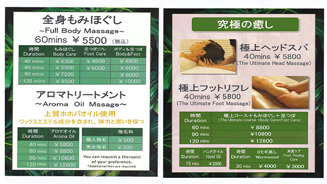 当店は硬くなった筋肉を丁寧にほぐして身体全体の疲れを除去するもみほぐし、足裏にある身体全体の反射区に刺激を与える事で、人が本来持っている自然治癒力を高めるフットケア、新陳代謝を良くすると同時に筋肉の緊張を取り除くアロマトリートメントを加え、気になる箇所を重点的にアプローチしていく 『極上シリーズ』もご用意。 お疲れに合わせてコースを組み合わせていただくことも可能です。